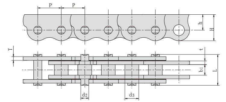 鏈號 節距 內節內寬 銷軸直徑 銷軸長度 鏈板尺寸 抗拉強度