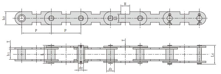 鏈號 節(jié)距 套筒直徑 內(nèi)節(jié)內(nèi)寬 銷軸直徑 銷軸長度 內(nèi)鏈板高度 鏈板厚度 附件尺寸 抗拉強(qiáng)度 每米長重