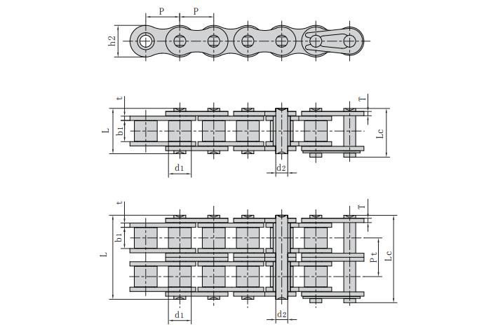 鏈號 節距 滾子直徑 內節內寬 銷軸直徑 銷軸長度 內鏈板高度 鏈板厚度 抗拉強度 每米長重