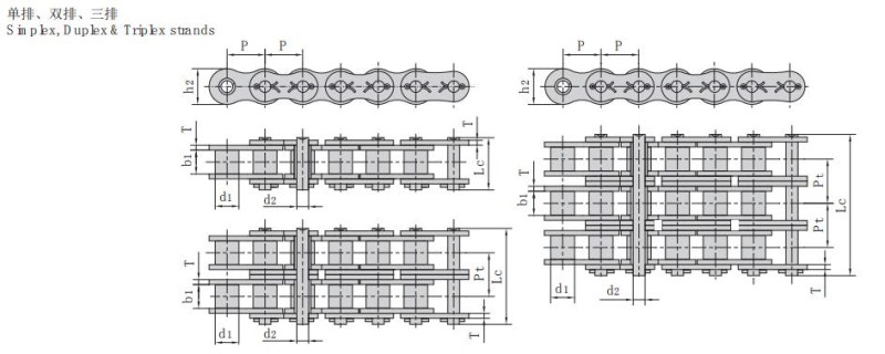 鏈號 節距 滾子直徑 內節內寬 銷軸直徑 銷軸長度 內鏈板高度 鏈板厚度 排距 抗拉強度 平均抗拉強度 每米長重