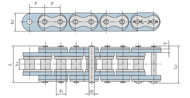 鏈號 節距 滾子直徑 內節內寬 銷軸直徑 銷軸長度 附板、鏈板尺寸 抗拉強度 每米長重