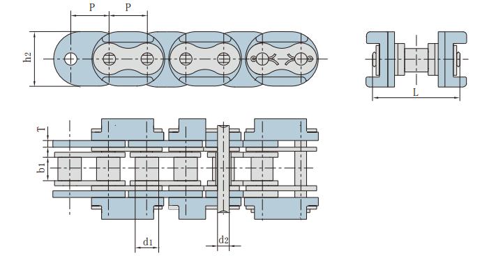 鏈號 節(jié)距 滾子直徑 內(nèi)節(jié)內(nèi)寬 銷軸直徑 銷軸長度 附板、鏈板尺寸 抗拉強度 每米長重
